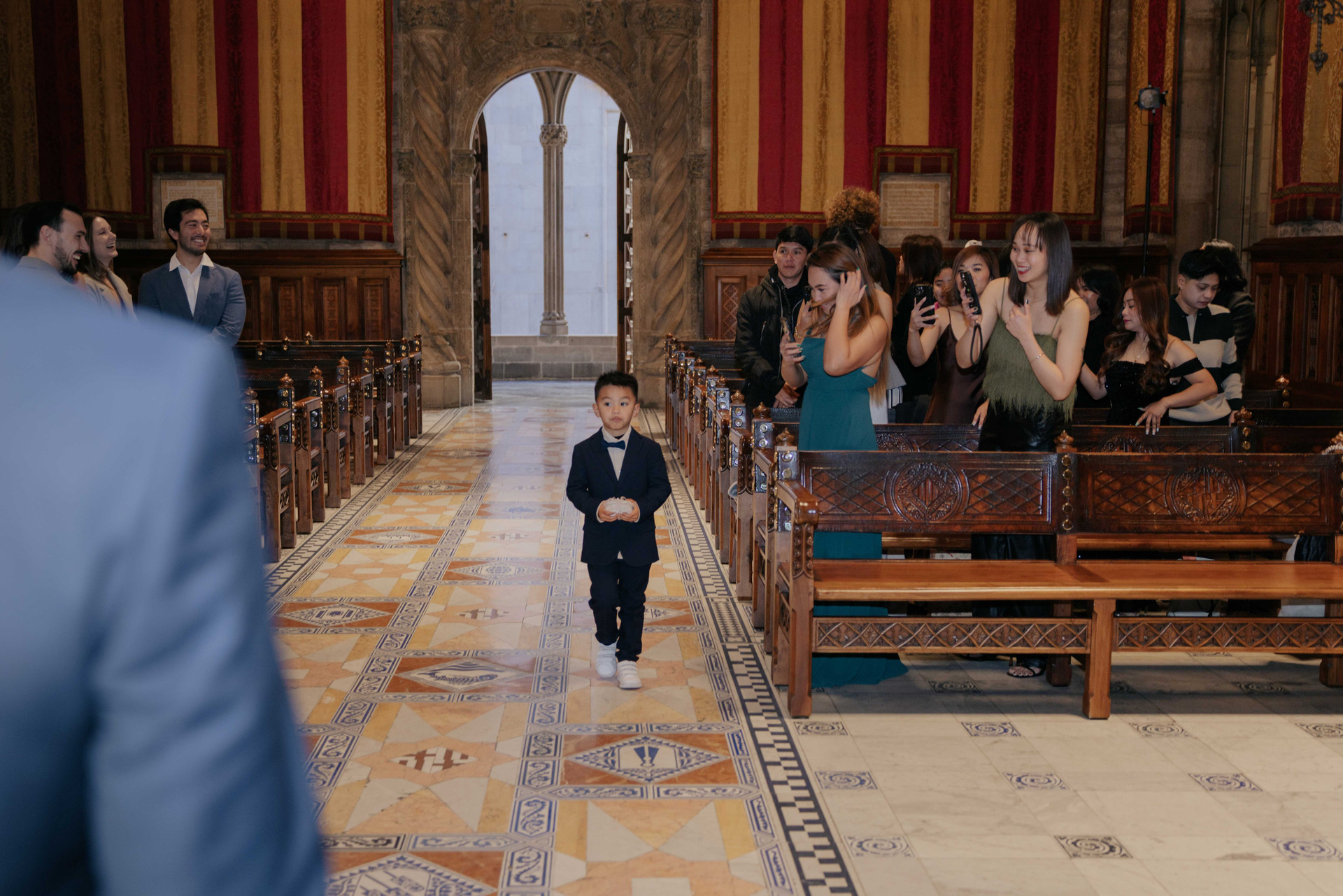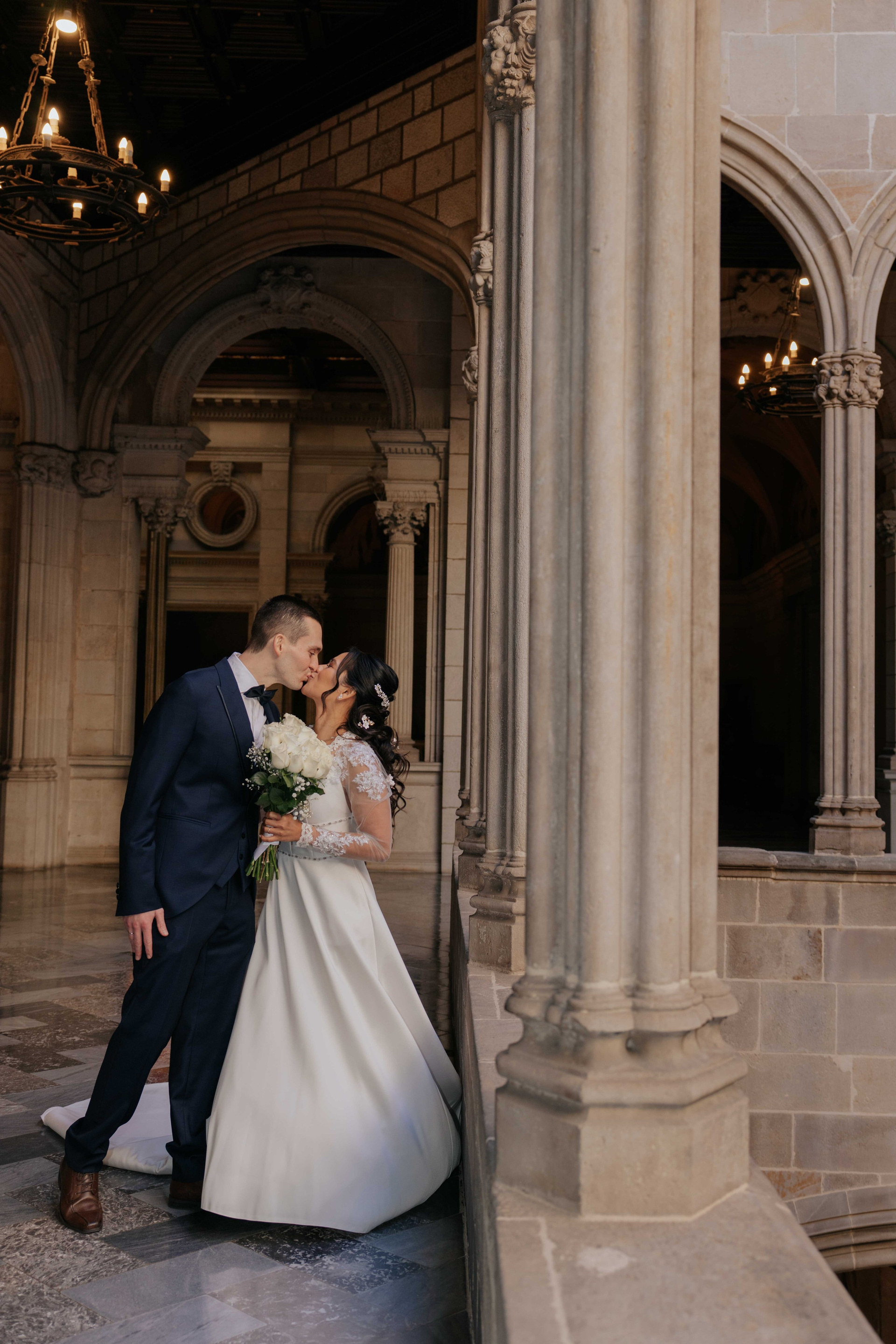 After the preparations, we walked together to the civil ceremony location — a beautiful government building with elegant staircases, arches, and large halls. The architecture created a stunning setting for both portraits and cinematic video moments with the couple and their guests.
